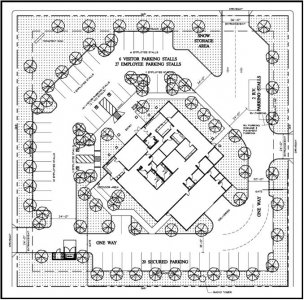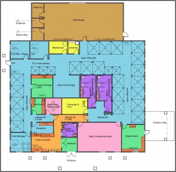 A 7,145 sq. ft. single-story Office Building with an attached 1,655 sq. ft. Warehouse. The building includes Lobby, Reception, Large Conference Room, Work Room, Mail Room, Open File Storage, Open Office Areas, Enclosed Offices, Break Room, Restrooms and a Covered Outdoor Patio.